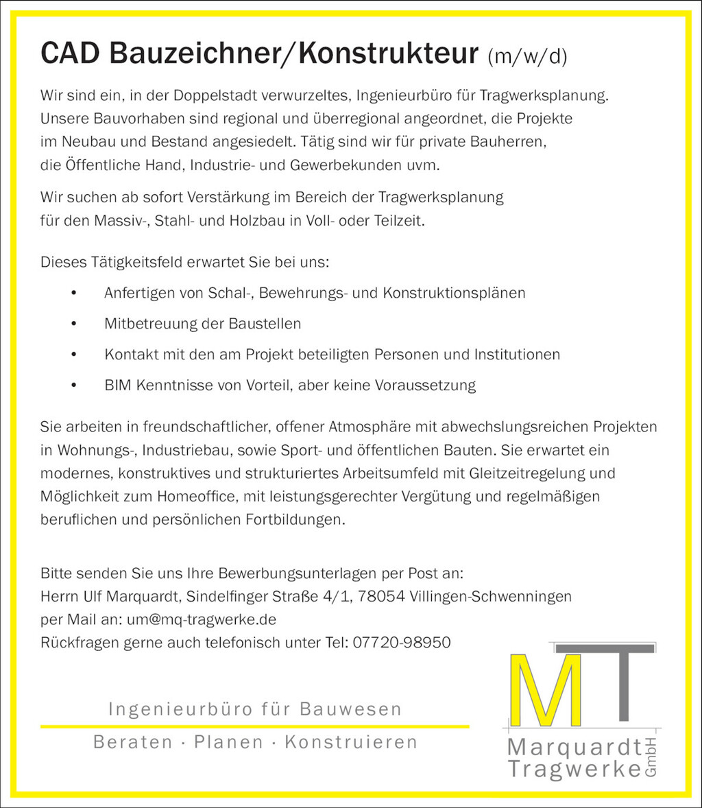 Wenn Sie glauben, dass Sie gut in unser Team passen würden und ein Auge für Detail, technisches Können und eine Leidenschaft für Bauingenieurwesen haben, laden wir Sie herzlich ein, uns Ihren Lebenslauf und Ihr Anschreiben an mail@mq-tragwerke.de zu senden. Obwohl wir momentan keine konkreten Stellenangebote haben, halten wir Ihre Unterlagen für zukünftige Möglichkeiten in unserem Unternehmen.